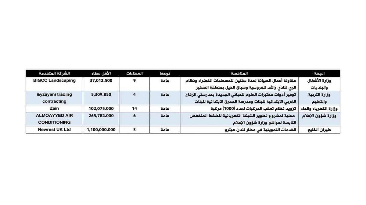وفتح مجلس المناقصات والمزايدات 36 عطاءً تقدمت لـ5 مناقصات تابعة لـ5 جهات حكومية، وبلغ إجمالي أقل العطاءات المستلمة نحو 1.5 مليون دينار.