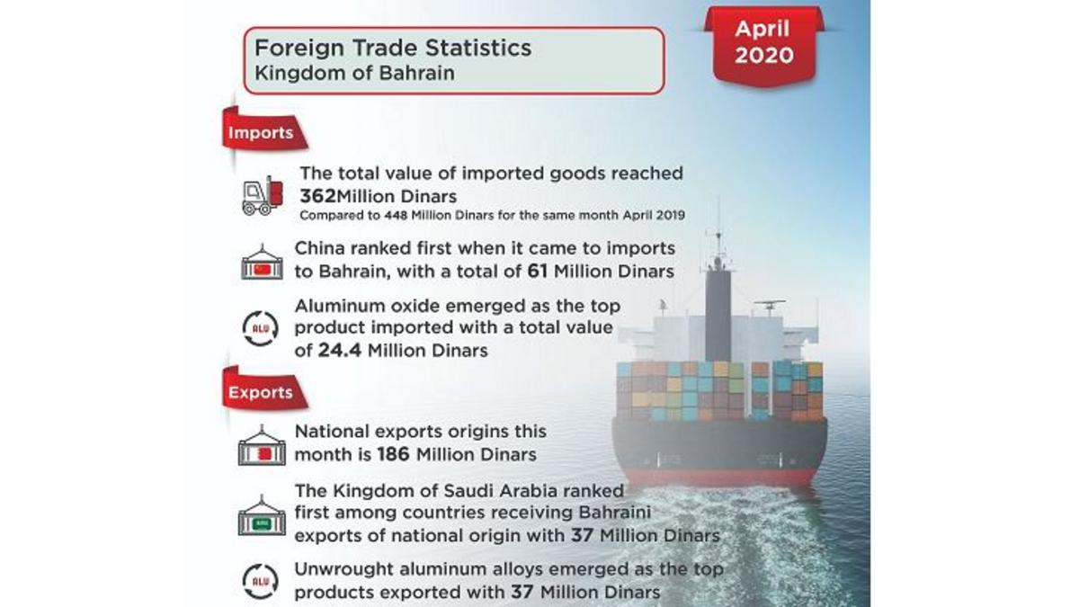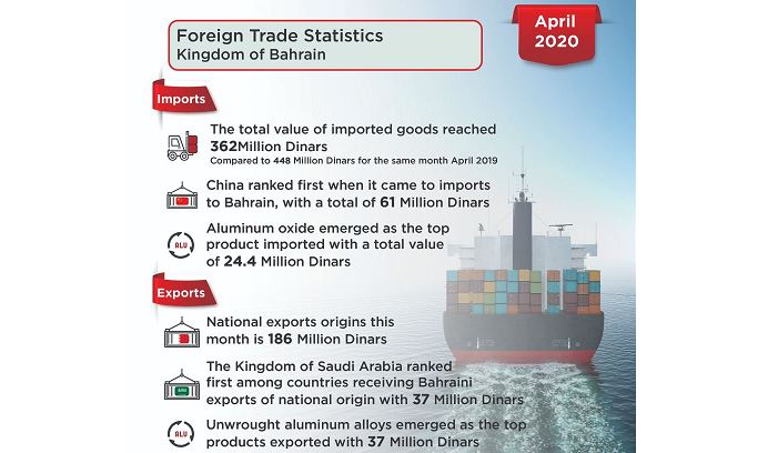 MANAMA: Bahrain’s national origin exports in April 2020 amounted to BD186 million, decreasing by nine per cent compared with BD204m for the same month of the previous year, shows the latest report from the Information and eGovernment Authority (iGA).