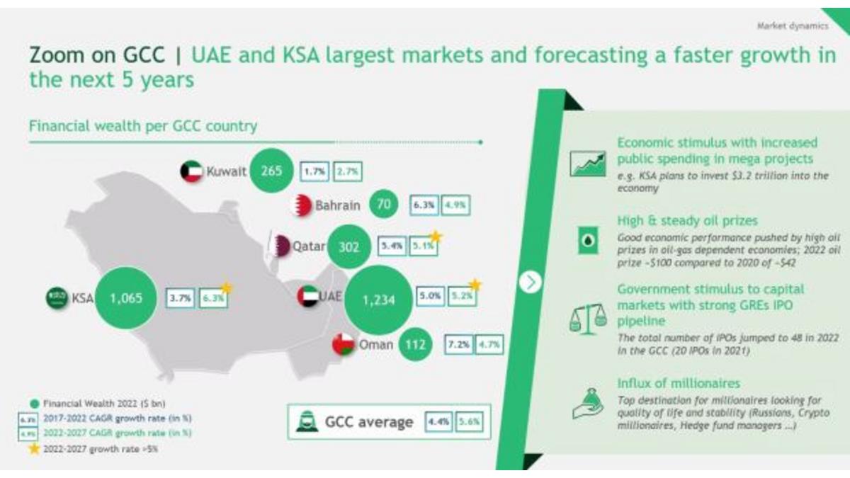 “Bahrain represents 1pc of the region’s financial wealth in 2022. Growing by 6.3pc per year from 2017, financial wealth has reached $70.2 billion in 2022, with a projection of $89.1 billion in 2027.