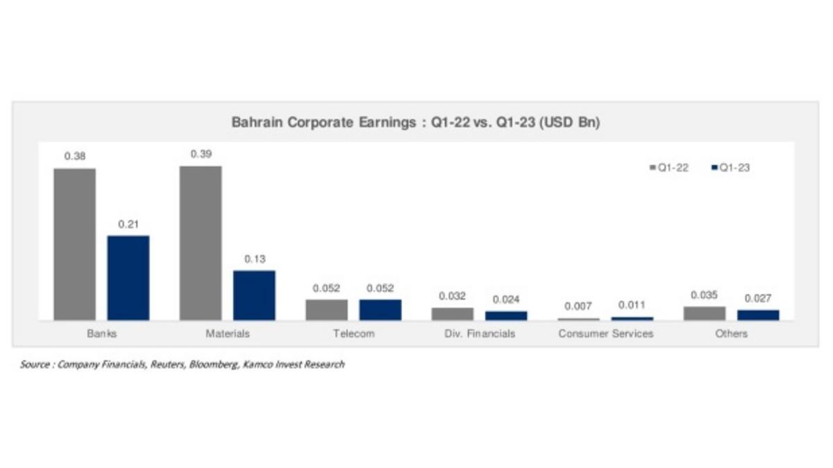 Total net profits of Bahrain-listed companies fell by nearly half in the first quarter of 2023, from $898.9 million in the same period of 2022 to $452.2m.