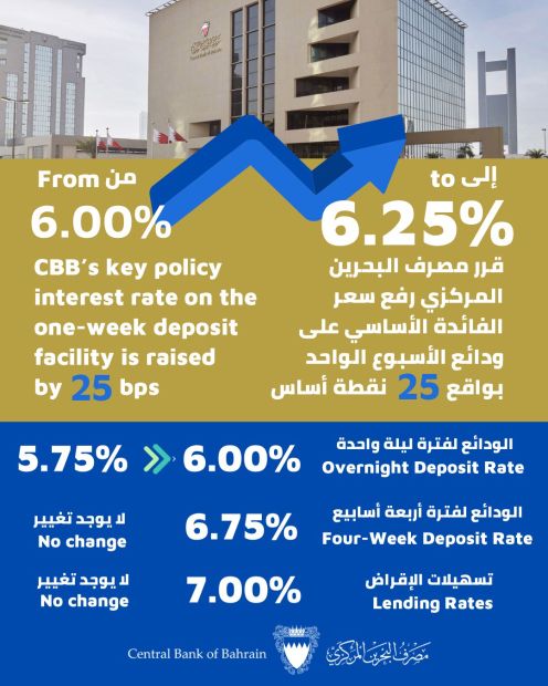 Bahrain’s banking regulator said the policy interest rate on the one-week deposit facility is raised from 6pc to 6.25pc.