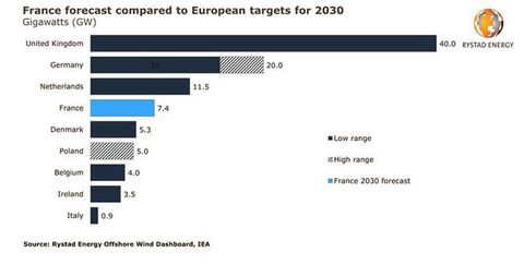 “France’s target for operational capacity in 2023 is 2.4 GW, a target expected to be reached through the completion of already awarded projects,“ said Alexander Fløtre, Rystad Energy’s vice president and product manager of offshore wind.