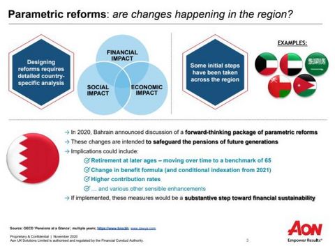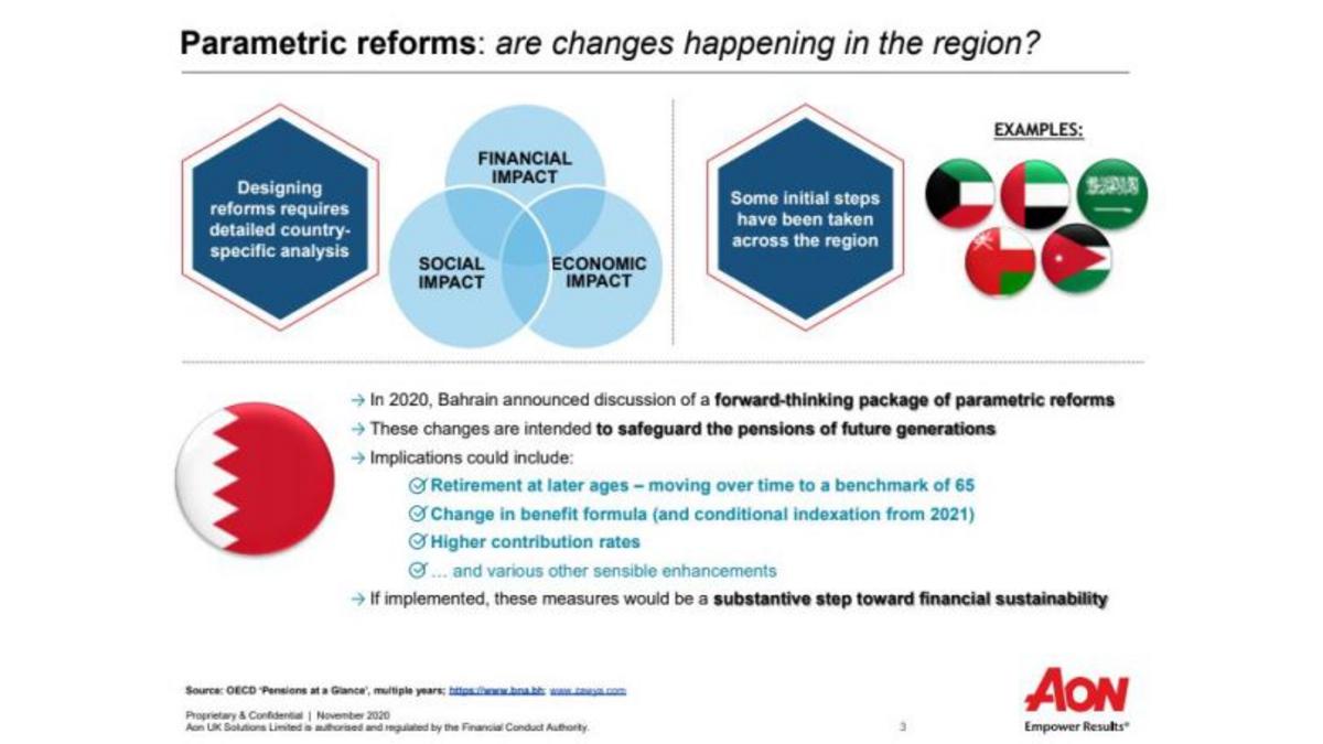 Bahrain’s parliament is discussing key reforms to the national pension system, including delaying the retirement age and increasing contributions, in a bid to extend its sustainability.This was revealed by global risk, retirement and health solutions provider AON’s associate partner Simon Herborn during the opening session of the two-day Arab Pensions Conference 2020, hosted virtually in Bahrain .